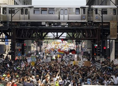On Sunday afternoon, May 20th, a people’s media would have interrupted normally scheduled programming to give extensive and appreciate coverage to the vast scale, rich diversity, brilliant pageantry, and splendid egalitarian and solidaristic spirit of the giant protest march that wound its way down Michigan Avenue to the heavily guarded hard perimeter of the summit at Michigan and Cermak Street (2200 South) on the afternoon of Sunday, May 21st. By my estimate, the march was at least 15,000 to 20,000 strong.