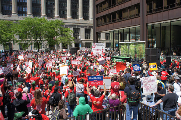On the afternoon of Friday, May 18th, a people’s media would have interrupted normally scheduled programming to broadcast live coverage of a remarkable rally in Chicago’s downtown. In Daley Plaza, that media would have shown, 5,000 people crowded in to support the implementation of a “Robin Hood tax” on financial speculators in order to more adequately fund social programs that have come under relentless assault in recent years and decades.