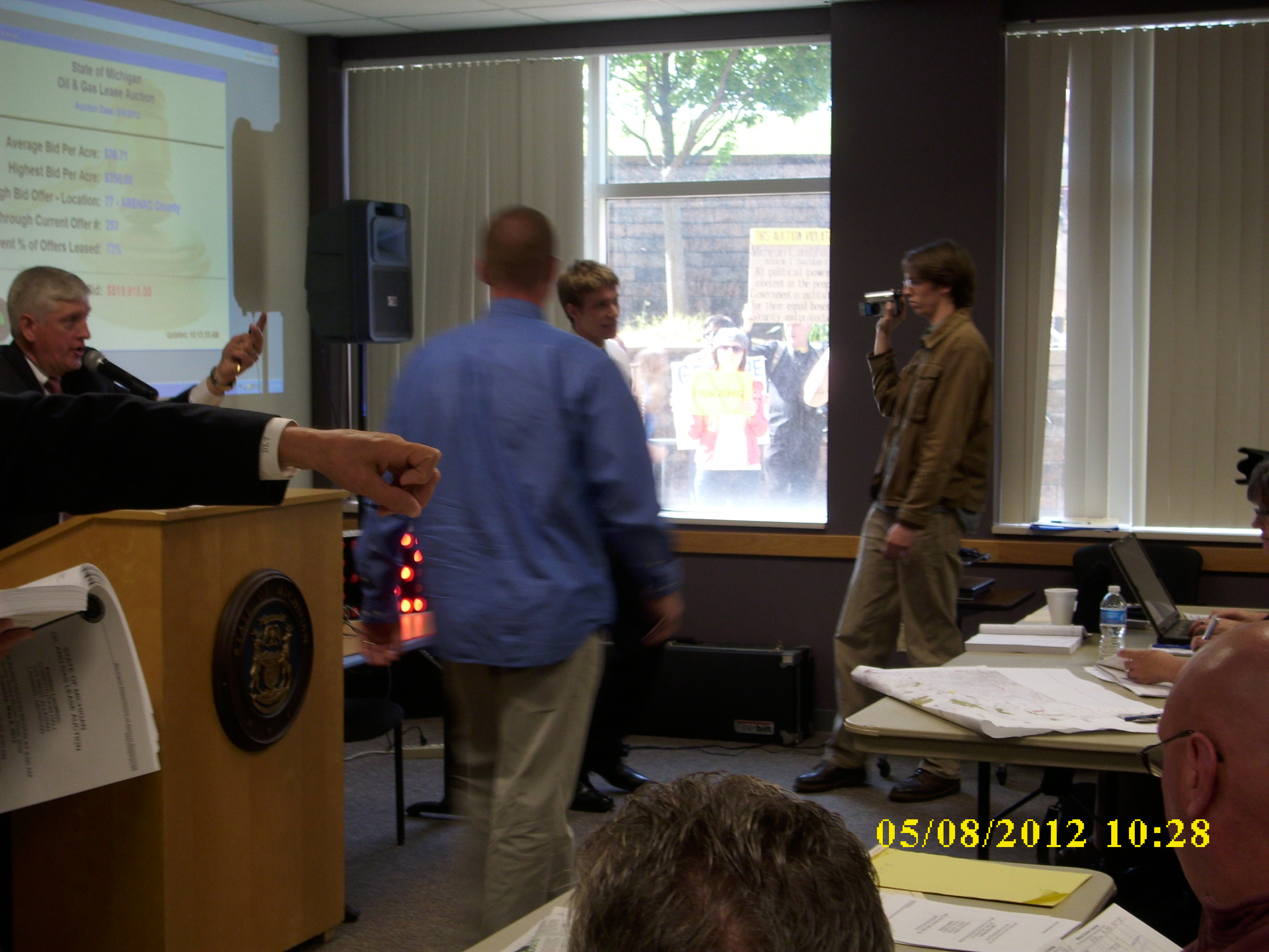 Though state auctions of mineral rights have occurred for decades, Mary Uptigrove of the DNR Mineral Management Division, when asked if the twice-yearly auctions usually drew much public attention, said she had never seen anything like the May 8 protest. “No, nothing like this, and I’ve been here for nine years.” Auctioneer Bob Howe of Sheridan Realty & Auction Co. agreed, noting that two years ago the MDNR had the largest auction ever in terms of money taken in, with a record $178 million for less acreage than the current May 2012 auction, which earned $3.5 million. The difference? Two years ago there was a frenzy of speculation, and our state legislators have obviously been hard at work, paving the way for the “natural gas renaissance [that] is upon us.”