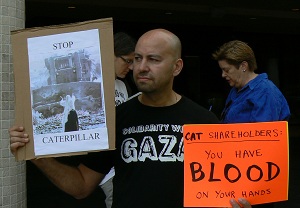 Early this morning, US Campaign member groups demonstrated outside and raised their voices inside the Caterpillar Corporation shareholders meeting for the 9th year in a row. This was just the most recent of a series of events that occurred this Spring, showing the corporation that its support for the Israeli occupation — notably supplying D9 bulldozers which Israel uses to demolish Palestinian homes, uproot olive trees, construct Jewish-only settlements and the Apartheid Wall, and kill and maim unarmed civilians — comes at a cost.