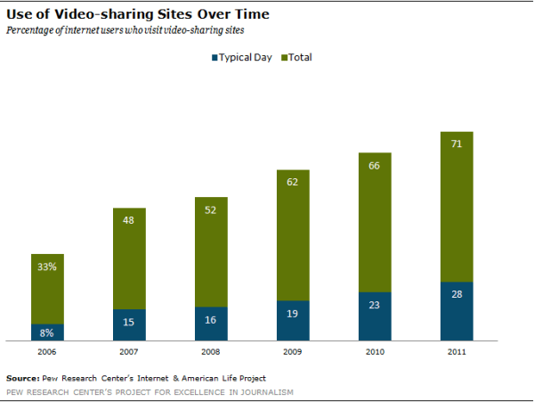 YouTube has also become a part of the lives of most Americans. Fully 71% of adults have used sites like YouTube or Vimeo at some time, according to a 2011 survey by the Pew Research Center’s Internet & American Life Project. That is up from 66% in 2010. And 28% visit them daily.