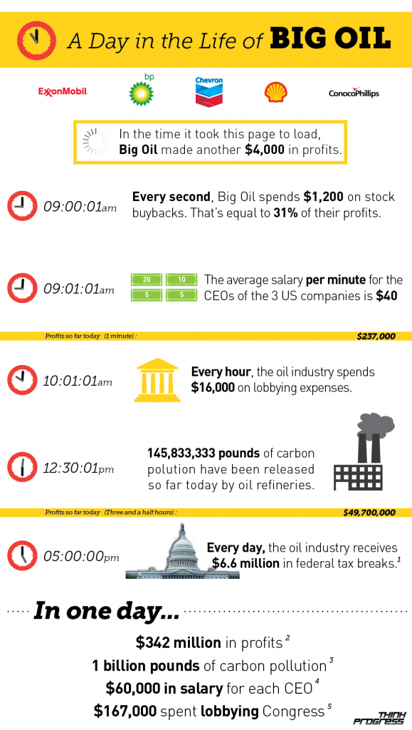 We should also remember that the blog that posted this graphic, Think Progress, is a project of the Center for American Progress which is a joke. Their politics are akin to MoveOn’s. They put pressure on the Democrats and Obama in some situations, but they always fall back in line when needed. Remember back in 2009 they provided a “progressive” justification (crappy as it was) for Obama’s escalation of the Afghanistan War right at the same time other groups were finally organizing against it? They didn’t seem to worried about “big oil” then. Today you can read about how we need to save the middle class, their latest policy prescriptions (showing that they fully support the current system which you can’t have without the destruction of the earth), their plans for continued economic growth fueled by “green” energy (not possible), etc.