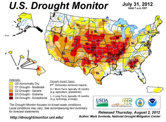 MORE THAN 50 percent of counties in the United States are now officially designated “disaster” zones. The reason given in 90 percent of cases is the continent-wide drought that has been devastating crop production. Forty-eight percent of the U.S. corn crop is rated as “poor to very poor,” along with 37 percent of soy; 73 percent of cattle acreage is suffering drought conditions, along with 66 percent of land given to the production of hay.