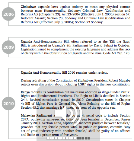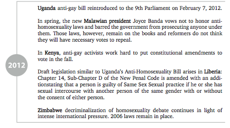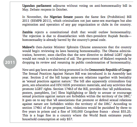 Colonizing African Values is an important and must read report for those who care about global solidarity, LGBT and reproductive justice. The research is well documented, with an excellent glossary of terms and US Christian groups involved. There is also an extremely valuable timeline of anti-LGBT bills and laws in Africa since 2006 that begins on page 27 of the report.