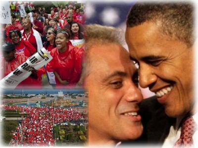 Besides the president, Rahm Emanuel had every newspaper and radio station in town, the Commerce Club and all the billionaires, scores of well-funded charter school operators and their contractors and hedge fund backers. He even had fake citizen groups like Democrats for Education Reform, which used money donated by its billionaire backers to run deceptive radio and TV ads (still running as of Tuesday night) aimed at inciting parents against the people who teach their children. Illinois is also one of twenty or so states that have passed corporate inspired “school reform” testing and curriculum measures into law, and drastically limited the issues over which teachers can negotiate along with the their right to strike.