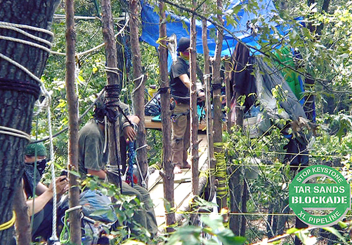 TransCanada started building the Texas section of the XL pipeline in early August. Since then, efforts to slow construction by a coalition of landowners, environmentalists and others, calling themselves the Tar Sands Blockade, have gone from protest demonstrations and lawsuits to non-violent civil disobedience actions including an elaborate blockade of treehouses on Sept. 24 in the path of pipeline construction in Winnsboro, Texas.
