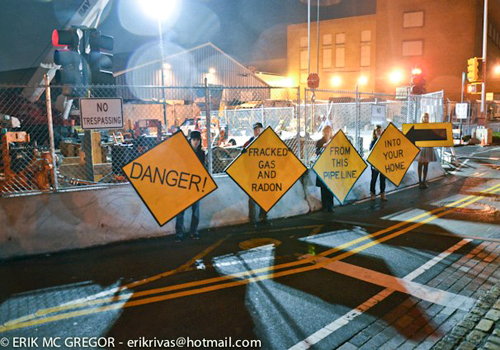 A hard rain was falling on Monday night as Occupy the Pipeline activists spread out along New York’s Hudson River Park, in front of the site where workers in orange day-glow vests have been laboring around the clock on the New Jersey-New York Expansion Project. Known colloquially by the name of its builder, Spectra Energy, the Spectra Pipeline will pump fuel hydraulically-fracked from Pennsylvania’s gas fields into New York City.
