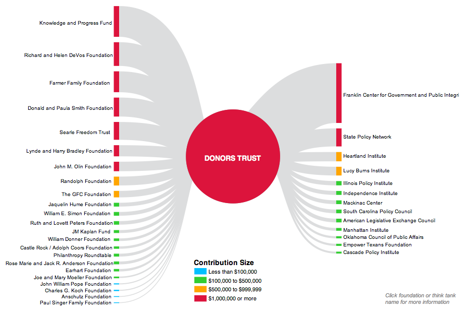 The article by the Center for Public Integrity report identifies usual suspects that channel money through Donor’s Trust, such as the Koch Brothers. However, if one looks at the graphic created by the Center, you can see that the Richard & Helen DeVos Foundation is the second largest contributor to Donor’s Trust, giving well over a million dollars.