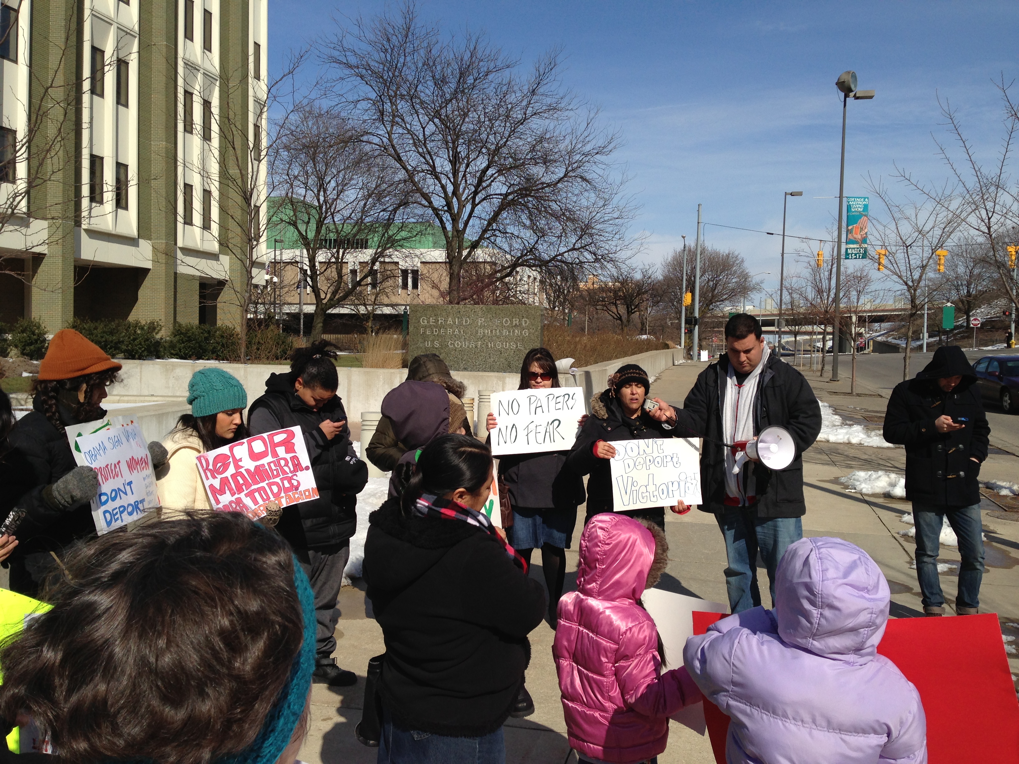 On Tuesday morning about 25 people gathered outside the federal building in downtown Grand Rapids to rally in support of Victoria Lorenzo-Calmo. Victoria is facing deportation to her native Guatemala as soon as Wednesday after unknowingly signing a voluntary deportation document, which will leave her three children either without a mother or without much needed medical care. All of Victoria’s children are U.S. citizens.