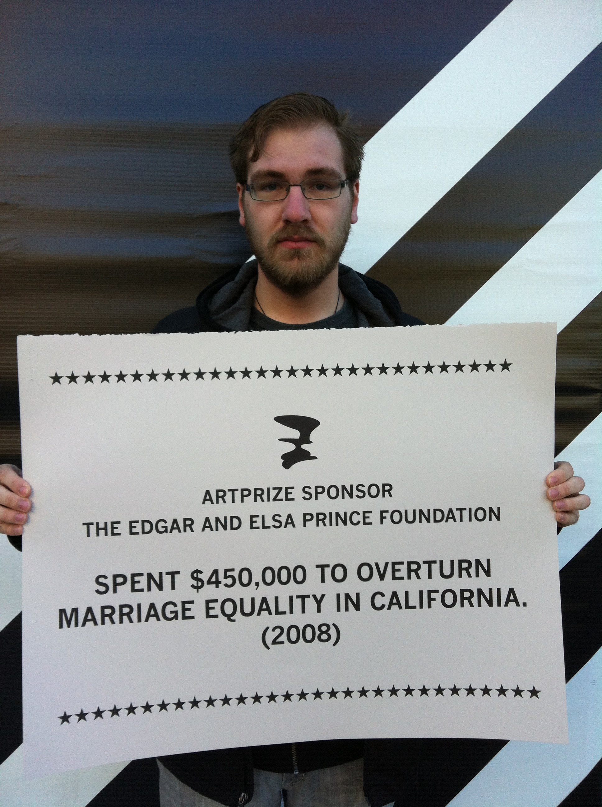 - In 2014, artist Steve Lambert generated lots of attention and discussion around the politics of ArtPrize, with both his installation piece and his announcement that if he won the prize money from ArtPrize he would donate it to a local LGBT effort, since the DeVos family has historically funded anti-gay campaigns. What Lambert was able to do was to force both ArtPrize and the larger community to ask more fundamental questions about the political economy of this annual monied spectacle.