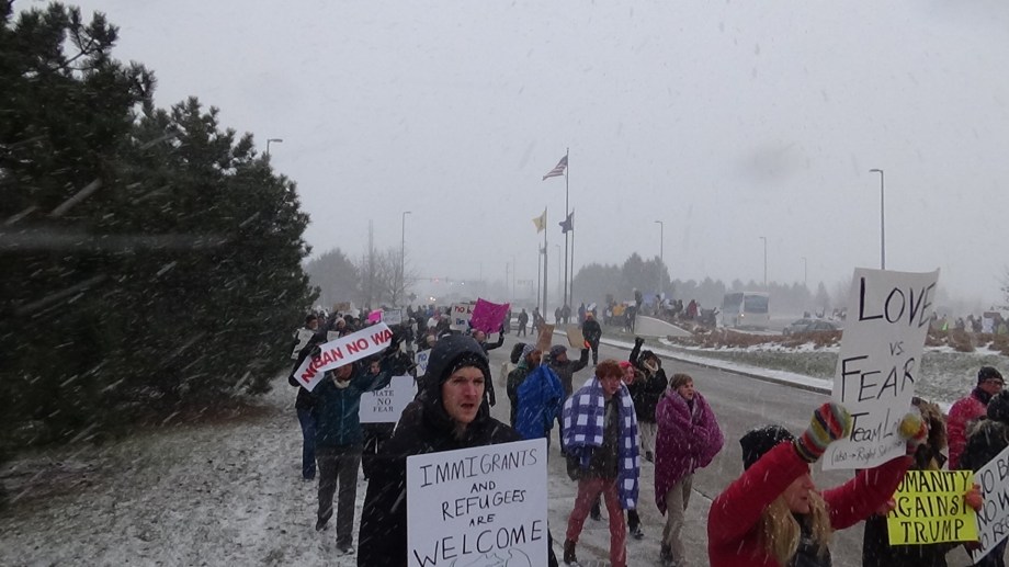Standing for Refugees, Immigrants and Muslims: Protest Defies Airport by not complying with designated “Free Speech” area