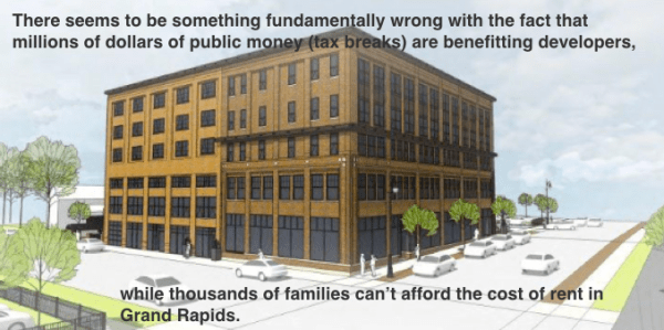 There seems to be something fundamentally wrong with the fact that millions of dollars of public money (tax breaks) are benefitting developers, while thousands of families can’t afford the cost of rent in Grand Rapids.