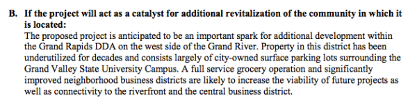 On page 134 of the Michigan Strategic Fund packet is states that the new grocery store will be “offering fresh food within easy access to transit and nearby walkable neighborhoods. The grocery component is expected to service all of the downtown as well as the neighborhoods within a 1 – 2 mile radius.” Let’s be clear that what most contemporary grocery stores offer is not primarily “fresh food,” instead they offer mostly highly process food items that can hardly be identified as fresh.