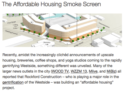 While it is true that there will be affordable housing units in this new project, this does not reduce the gentrifying effect that Rockford Construction has had on the westside and in other parts of the city. The blog, If the River Swells, aptly entitled an article from last year, The Affordable Housing Smoke Screen. All of the housing units that Rockford Construction has been involved in on West Fulton St, Bridge St and Alabama have all been market rate housing. This means that there is a whole class of people who cannot afford to live in these places.