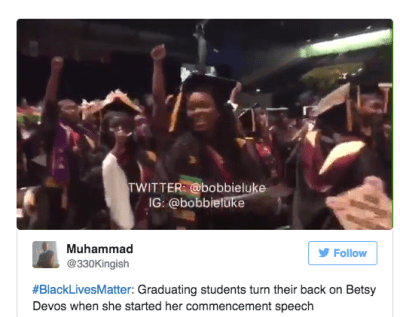 When DeVos was introduced students began booing and yelling to attempt to drown out the Secretary of Education. Many of the graduating students also stood and turned their backs on DeVos and the administration that invited her, all of which can be seen in this video.