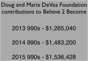One of the projects the DeVos Family has had their hands in and provided a substantial amount of funding to, is the GRPS-supported project, Believe 2 Become. The Believe 2 Become initiative is funded by the Doug and Maria DeVos Foundation. According to the most recent 990s, the Doug and Maria DeVos Foundation has increased each year the amount of money they have donated to Believe 2 Become.