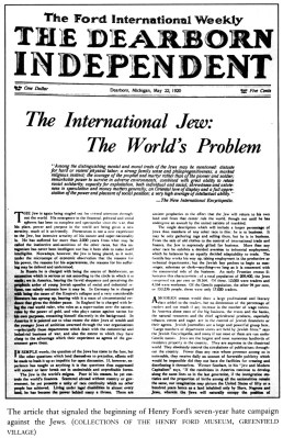 Henry Ford did own and operate the Dearborn Independent from 1919 – 1927, although his anti-Jewish beliefs had begun before that. When Ford took over the newspaper, he moved it to one of his factories. Henry Ford was also deeply influenced by the book, The Protocols of the Learned Elders of Zion. This book claimed there was a global Jewish conspiracy and that was a mix of global finance and global war-making. Ford even re-printed sections of the book in the Dearborn Independent, under a regular heading of, “The International Jew – The World’s Problem.”