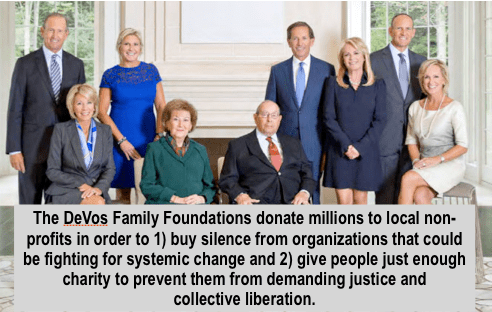 It seems clear that the kinds of organizations that the DeVos Family foundations are funding that are working in or based in the southeast part of the city that is being targeted under the AmplifyGR project are social service agencies, Christian groups and organizations focused on entrepreneurial opportunities. What these organization don’t do is provide any real analysis of systemic oppression or skill building for challenging systems of power. This seems rather obvious when one considers that the DeVos Family and their foundations are rooted in power, thus they would not want to provide funding that in anyway undermines their own power and this is exactly what the AmplifyGR project is all about…….not challenging systems of oppression and systems of power.