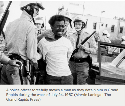 The first article in the series is entitled, Grand Rapids 67 riot: when anger, oppression erupted into ‘chaos.’ There are dozens of accompanying photos that solidify the dominant narrative, showing white cops arresting or detaining black suspects.
