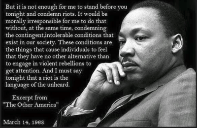 However, as Dr. King so eloquently put it, riots are the “language of the unheard.” In addition, riots are a response to the structural and daily violence imposed by the systems of capitalism and white supremacy on communities of color. Structural violence is the daily oppression that communities of color experience in the form of poverty, lack of adequate housing, poor health care, lack of educational opportunities and environmental racism.