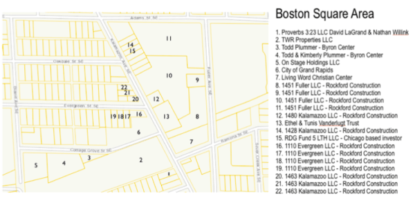 These maps, unfortunately do not provide very clear details on the actual properties that have been purchased by Rockford Construction, unlike the maps we have provided in pervious postings (shown below) and the MLive article, which provides pictures of the properties they have purchased.