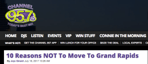 A few weeks back a local DJ with 95.7FM, posted a piece entitled, 10 Reasons NOT to Move to Grand Rapids.