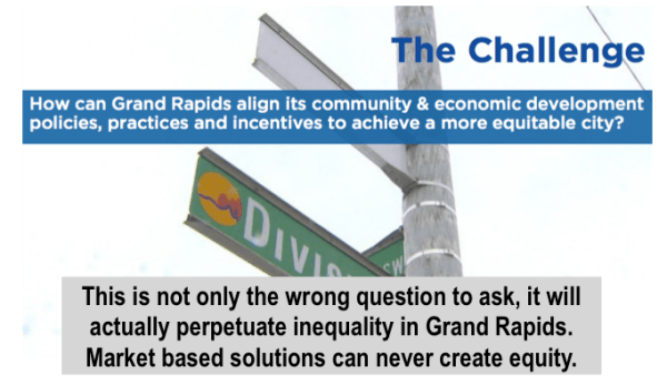 - Incentivize development beyond downtown – For me, this sounds like they want to expand the same kind of development process used in the downtown area and expand it to other parts of the city. For those who have not bought into the market-based mindset, the development that has occurred in recent decades in downtown GR has primarily benefited the wealthier sectors of this community and at the same time further marginalized those experiencing poverty and communities of color, particularly in the Heartside area. This first recommendation simply means they want to duplicate the downtown development model in our neighborhoods.