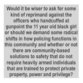 Would it be wiser to ask for some kind of reprimand against the officers who handcuffed at gunpoint the 11 year old black girl or should we demand some radical shifts in how policing functions in this community and whether or not there are community-based solutions to safety that do not require heavily armed individuals that are trained to protect private property, power and privilege?