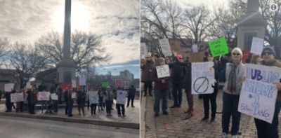 Before the graduation ceremony people gathered outside of the auditorium to protest the decision of the university to have DeVos as the commencement speaker, as you can see in some of these photos above.
