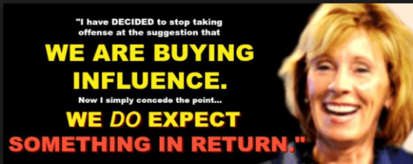 In addition, the DeVos Family is notorious for spending millions of dollars to buy candidates and lobby policies. This political spending is considered a form of speech that seeks to silence those who do not have deep pockets, like the DeVos Family. Betsy DeVos herself has said, “I have decided to stop taking offense at the suggestion that we are buying influence. Now I simply concede that point…..we do expect something in return.” This admission should be understood from a class point of view that rich people, by virtue of their wealth, have the loudest voices in society today.