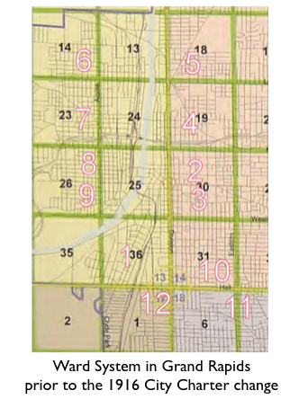 One thing that we did not mention in the Tuesday article, is that Grand Rapids used to have a different form of government. In the early part of the 20th century, Grand Rapids did not have a City Manager, instead the city was led by a strong Mayor, with a 12 ward system.