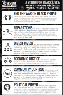 This flies in the face of what black people have been saying for decades about cops, which is in intricate part of the platform of the Movement for Black Lives, reflected here on the right. In Grand Rapids more cops playing basketball with black youth is just another “West Michigan Nice” response.