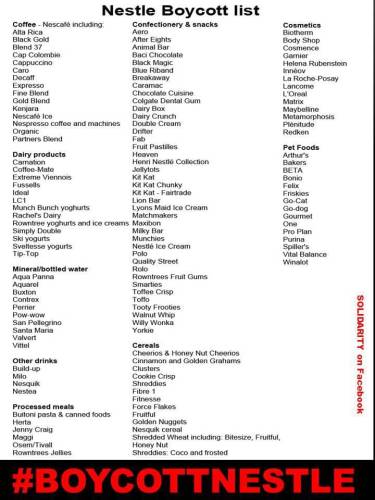 Many people have no doubt seen various memes calling for a Boycott of Nestle or lists of brand names that the massive multination corporation owns, where in people are also being called upon to boycott these products. Boycotts can be an effective tactic and it certainly is a good mechanism to raise awareness, but boycotting Nestle or just posting images with all their branded products is not enough.