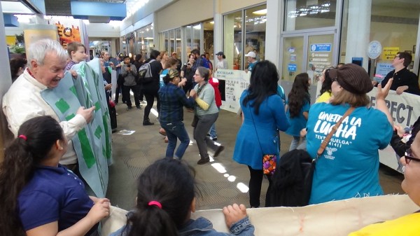 Just over 50 people participated in the Cosecha GR action, by going inside the Rogers Plaza and having a presence in front of the Secretary of State office. Part of the action was to have people dance to music, as a means to disrupt business as usual and to draw attention to the campaign for those inside the mall and/or the Secretary of State office, as you can see from the pictures.