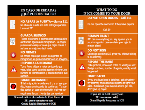 - You can share this card, which provides information for immigrants on what to do if ICE shows up. Calling 211 can get you connected to the GR Rapid Response to ICE group, which can mobilize people to take action.