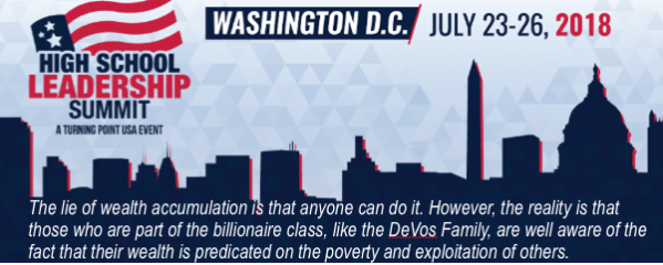 The high schools students who attended to the Turning Point USA summit certainly believe this truism, that the US is the greatest country in history. In fact, it is a fundamental belief that isn’t just embraced by conservatives, but by many liberals as well. In fact, those who are the beneficiaries of this freedom and prosperity, people like the DeVos Family, are well aware of the fact that the prosperity of the US really means the prosperity of the few, act the expense of the many. The lie of wealth accumulation is that anyone can do it. However, the reality is that those who are part of the billionaire class, like the DeVos Family, are well aware of the fact that their wealth is predicated on the poverty and exploitation of others.