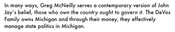 Like John Jay, McNeilly understands that those with real power in the US are the owners, members of the private sector, not the politicians. One only need to look at who the largest political donor in Michigan has been for the past 20 years, the family that McNeilly works for, the DeVos Family.