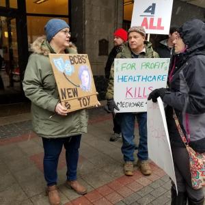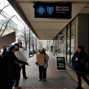 Demonstration outside Blue Cross/Blue Shield office in downtown GR prompted because of Gov. Elect Whitmer’s appointment to Transition Team