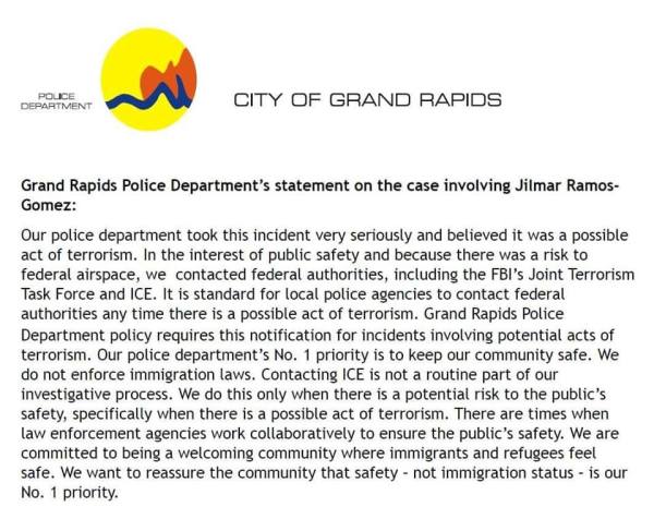 The GRPD’s evasive public statement raises more questions than it answers. The GRPD asserted that because the incident for which Mr. Ramos-Gomez was arrested involved federal airspace, the GRPD contacted federal authorities. We appreciate that there are situations where it is appropriate to coordinate with relevant federal law enforcement agencies. But why did the GRPD contact ICE? ICE is the federal agency responsible for immigration enforcement, and the GRPD had Mr. Ramos-Gomez’s U.S. passport, license, military ID, and U.S. Marine Corps tags. What made the GRPD think that Mr. Ramos-Gomez was illegally present in the United States? Would the GRPD have called ICE if Mr. Ramos-Gomez were white and his name was John Smith? How many times does the GRPD call ICE on members of our community and how many of them are people of color? Former GRPD Chief David Rahinsky has publicly represented that GRPD is not concerned with immigration status and does not target immigrants.1 But that was not true in Mr. Ramos-Gomez’s case. And we, along with many members of the community, believe it is frequently not true in other cases. We demand an explanation as to why the actual practice of the GRPD here diverged from its public statements. We also demand transparency about GRPD’s actual practices with respect to ICE, including public disclosure of data on the number and nature of GRPD-ICE interactions.