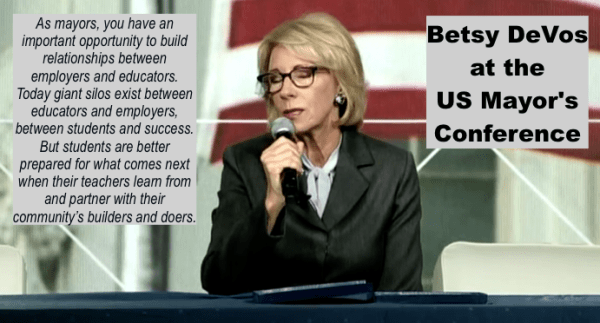 This message is exactly what Betsy DeVos delivered at the 87th annual Mayor’s Conference last week, held in Washington, DC. You can read her speech by going to this link, but what follows are the most relevant quotes related to the theme that DeVos addressed.
