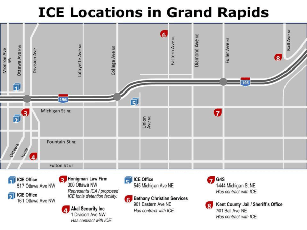 While we took a moment to celebrate the end of the contract between ICE and Kent County, we know that the struggle continues. ICE is deeply embedded in our community and we plan to fight them until they leave the county. You can see from the map below, the various ways that ICE operates in Kent County, where their offices are, which companies have contracts with them and other relationships.