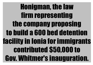 For example, the AFL-CIO contributed $10,000, but are they expecting that workers rights, workplace democracy, wages, benefits, etc will improve under Governor Whitmer or are they just hoping that things will not get worse than they already are for working class people? Honigman law firm, which contributed $50,000, might be expecting the State of Michigan to endorse the proposed ICE detention facility in Ionia (run by ICA). One could argue that other contributors from the private sector are not just buying access, but expectations that the Whitmer administration will be friendly to business interests throughout the state.
