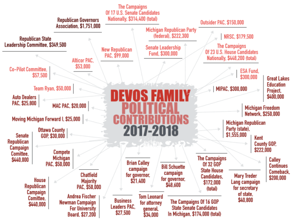 We know that the DeVos family supports charter schools and private schools over public education. We know that the Michigan legislators who have received funding from the DeVos family have voted for directing taxpayer money to charter schools, passed legislation to shift public school teacher pensions away from traditional pension funding to a 401K system.