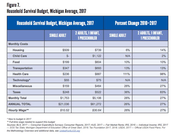 There is a recognition in this new report that nearly half of the households in Michigan are financially struggling. The report includes lots of data, like what you see in the graph above. However, the notion of what individuals and families need to live off of can and should be challenged, since many of the amounts listed above would be inadequate. For example, the housing cost for an individual and a family doesn’t fit the current housing costs in West Michigan.