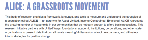 Another aspect of the news coverage about the ALICE report, is that we primarily get the perspective of those who work in the social services field and those in the United Way. We do get some insight into the realities facing families who are struggling, but their lived experience is not center or explored in depth.