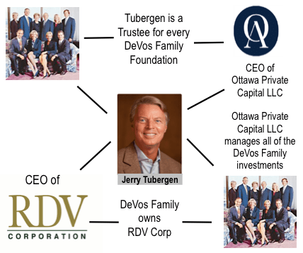 In addition to being the CEO of RDV Corporation, Jerry Tubergen is listed as a trustee for every DeVos family foundation, according to the 990 reports. Thus Jerry Tubergen is a trustee of the Dick & Betsy DeVos Foundation, the Doug & Maria DeVos Foundation, the Dan & Pamela DeVos Foundation and the Richard & Helen DeVos Foundation.