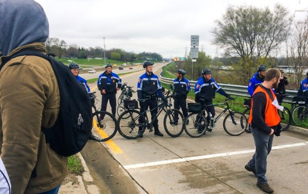 At one point we realized that the Michigan State Police also had their own bicycle squad. While walking south on Division, not only did we realize that the State Police were there, but that even more GRPD officers were present in cruisers blocking roads. As we approached 28th street, the number of police grew even more, as the Wyoming police now joined the already excessive police presence, mostly in cruisers. At this point there were easily more than 100 cops present to make sure that we did not march in the street.