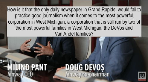So, how is it that the only daily newspaper in Grand Rapids, would fail to practice good journalism when it comes to the most powerful corporation in West Michigan, a corporation that is still run by two of the most powerful families in West Michigan, the DeVos and Van Andel families?