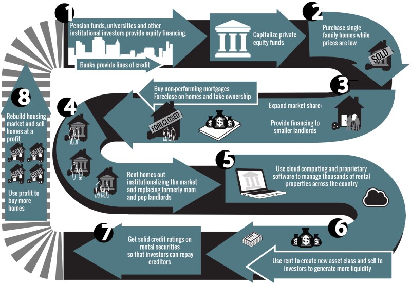 Second, Acrisure, the insurance brokerage firm that received $7 million in public funds, last year got $2 billion from investors that now puts the corporation’s value at about $7 billion. One of the investors was Blackstone, which refers to itself as, one of the “world’s leading investment firms with over $457 billion in assets under management, including investment vehicles focused on private equity, real estate, public debt, and equity, non-investment grade credit, real assets and secondary funds, all on a global basis.” In reality, Blackstone is one of the corporations globally that has bought up tens of thousands of single family home properties and turned them into rental units to make massive profits over the past decade. (see graphic below from Right to the City)