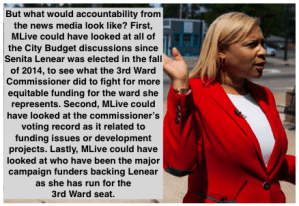 But what would accountability from the news media look like? First, MLive could have looked at all of the City Budget discussions since Senita Lenear was elected in the fall of 2014, to see what the 3rd Ward Commissioner did to fight for more equitable funding for the ward she represents. Second, MLive could have looked at the commissioner’s voting record as it related to funding issues or development projects. Lastly, MLive could have looked at who have been the major campaign funders backing Lenear as she has run for the 3rd Ward seat. There are campaign finance records that are easily accessed from the County Clerk’s office. One section of Commissioner Lenear’s 2014 campaign finance reports tells an interesting story about who back her first campaign.